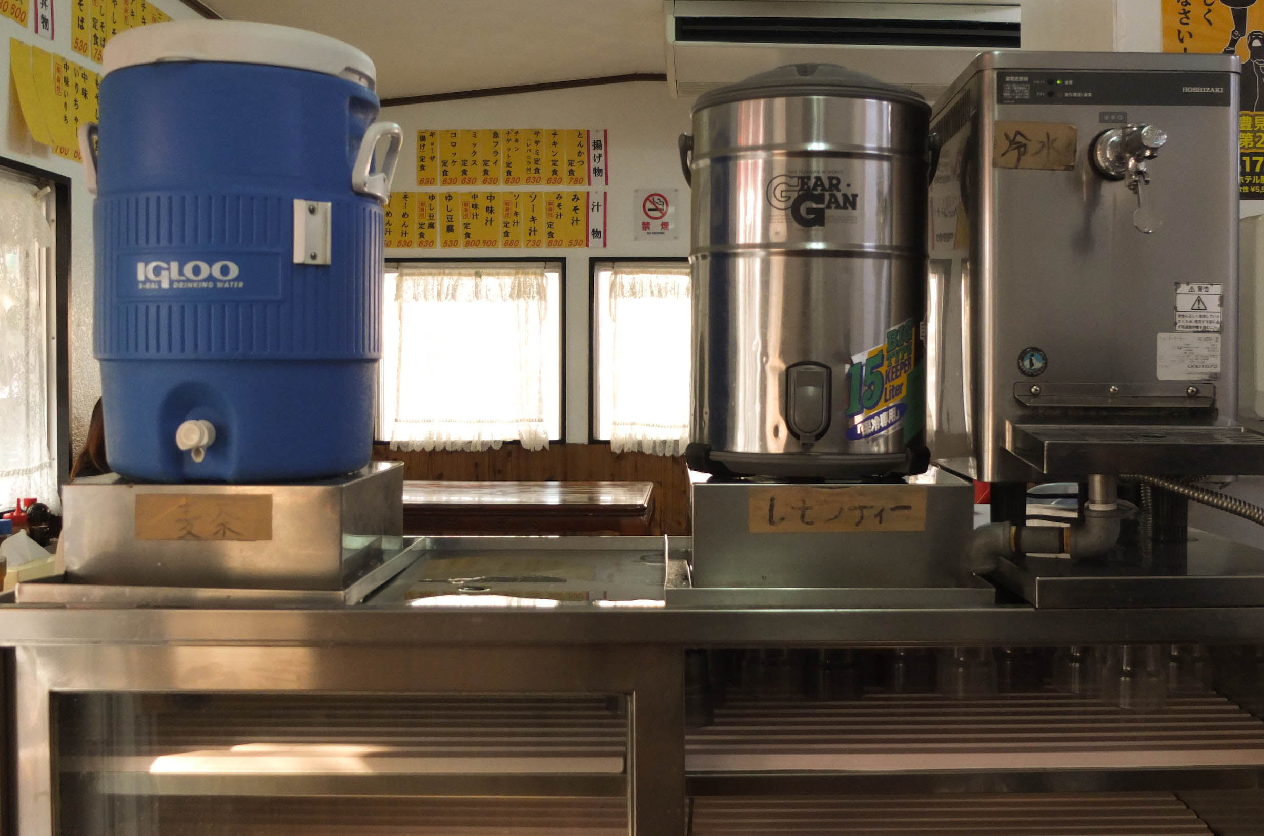 Logo, vem uma senhora de uns 60 anos e pergunta se já decidimos. Sim; pedimos goyá chanpuru e Okinawa sobá. Ela não anota o pedido e volta para a cozinha, exposta atrás do balcão. Aqui, o chá gelado é self service. Os copos de plástico estão ali empilhados e o galão está cheio de chá meio aguado. Nos servimos e esperamos sentados olhando para os outros clientes.