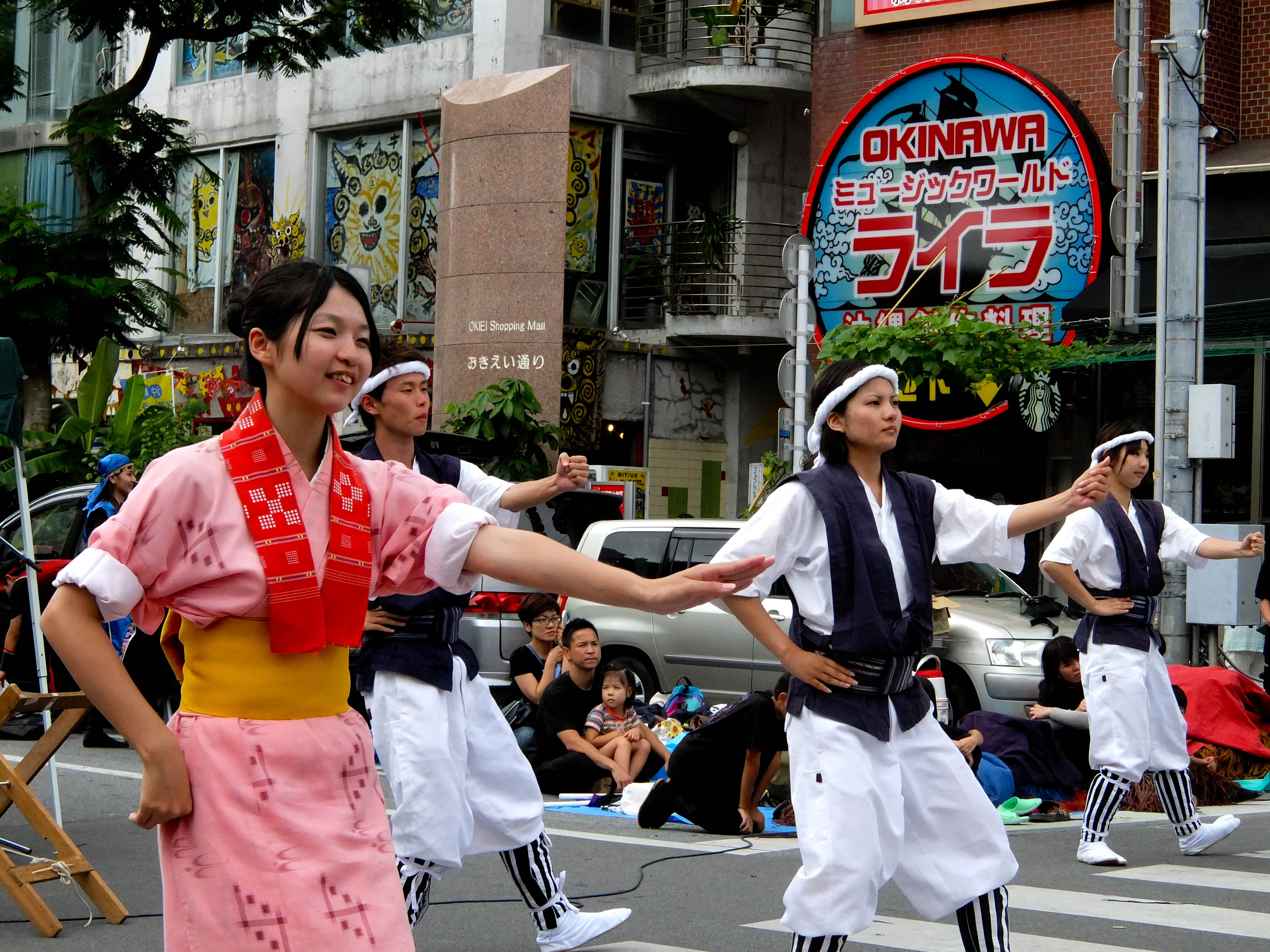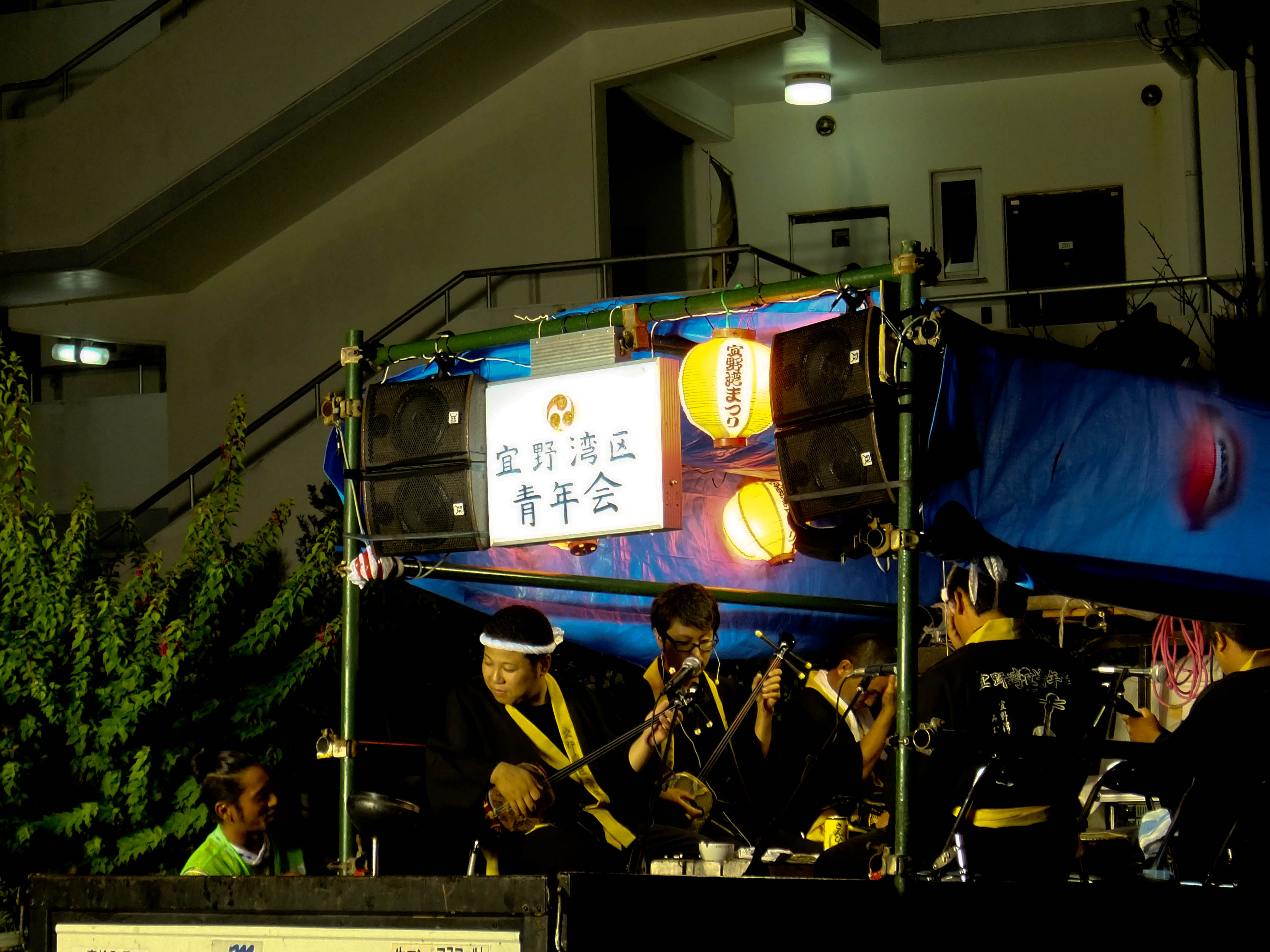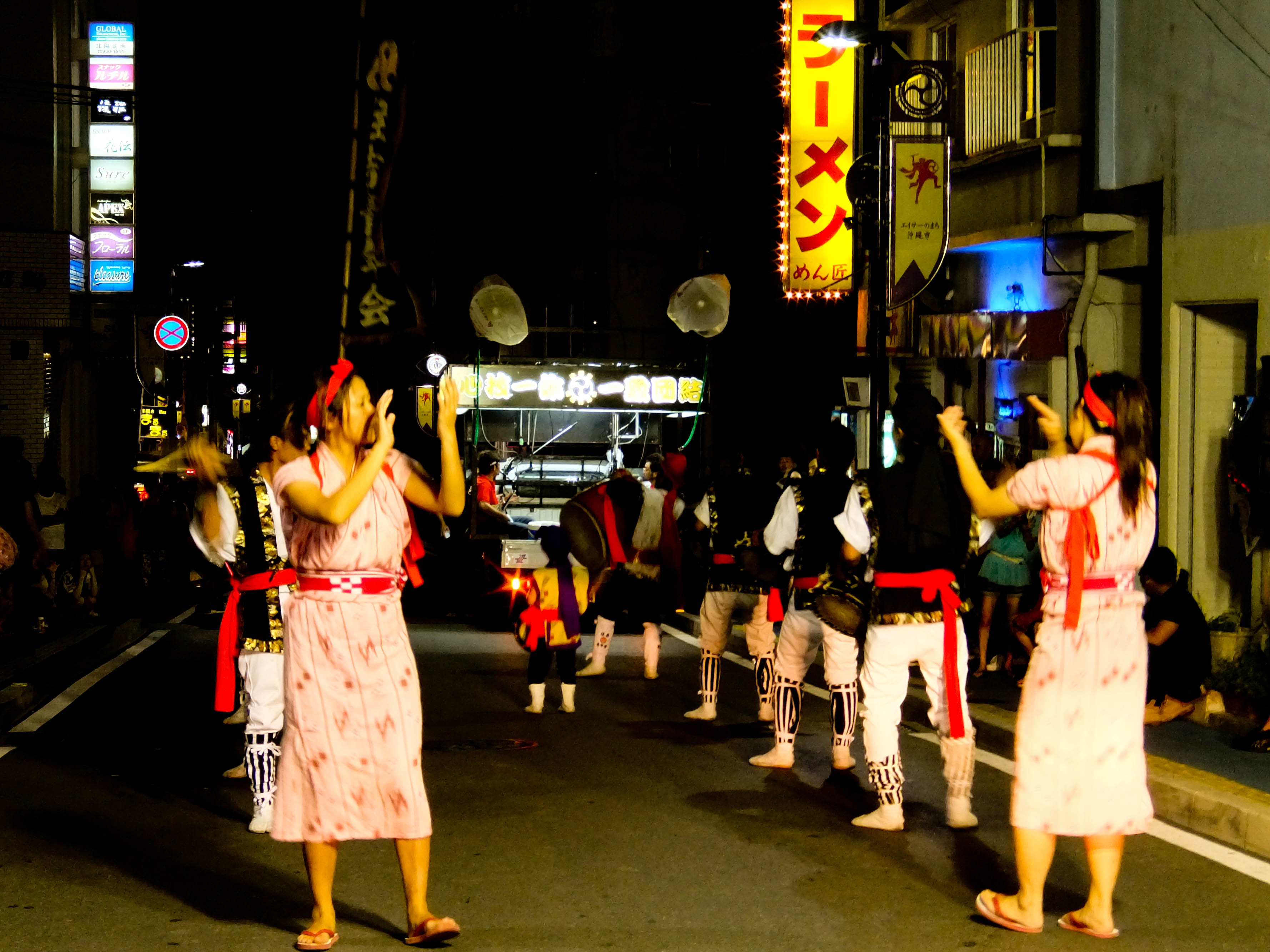 Ūkui, 23h. A avenida 330 (san-san-maru), que atravessa a cidade de Okinawa-shi, está cheia de carros no bairro de Sonda, e não há lugar para estacionar. Muitas pessoas andam pelas calçadas que normalmente são vazias. Há famílias, grupos de amigos, americanos, idosos. Todos perambulando em busca dos grupos de eisá, que se ouve mas não se sabe onde estão – é preciso procurar. Quando encontramos, está acontecendo uma batalha – dois grupos frente a frente, tocando ao mesmo tempo.