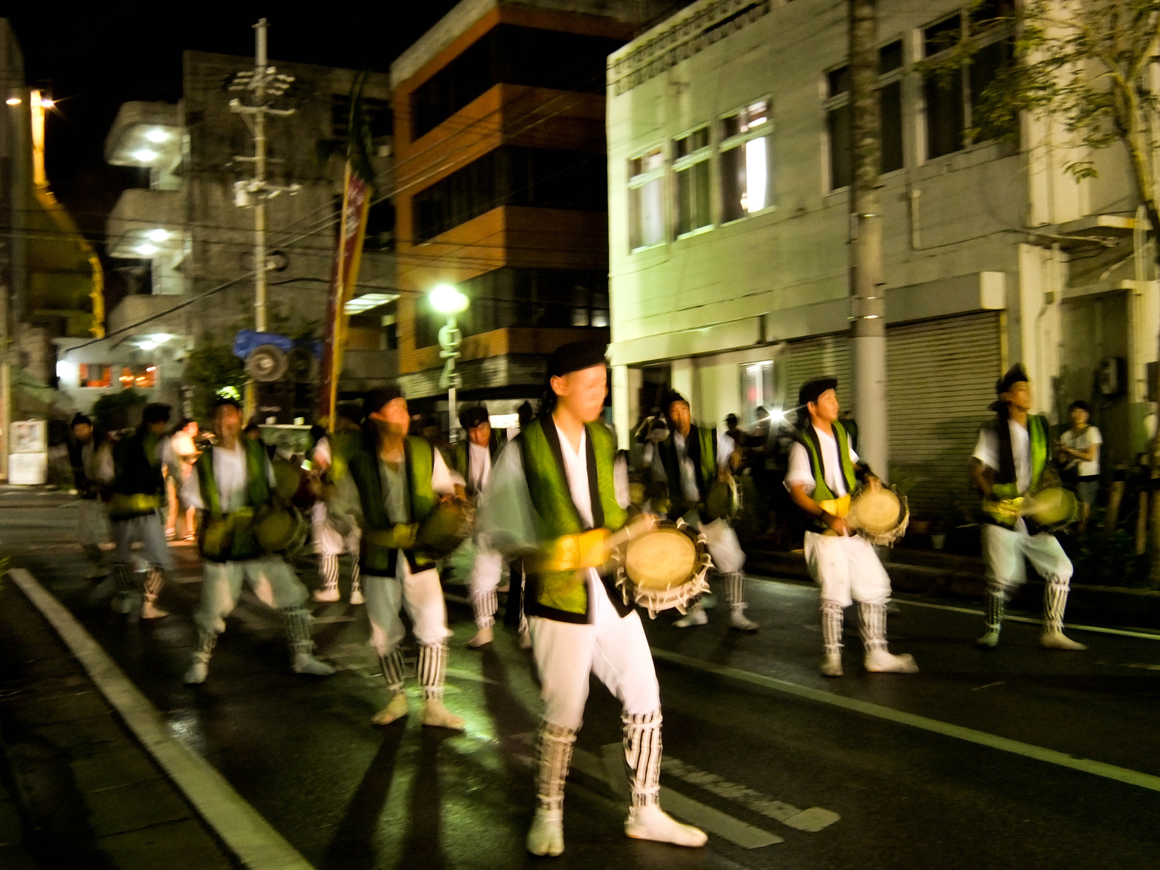 Unkē, 20h. Tudo começa na casa dos meus parentes em Okinawa-shi, a família reunida jantando “comida de missa”. Então, ouço lá de longe: DON! DON! DON! O tio diz: “é o eisá, ta vindo daquele lado”. A tia retruca: “Não, é do outro”. E com a calma, com a certeza de que o grupo vai passar em frente à casa, descemos para esperar e assistir o “desfile” – michijunē. Demorou, mas o som dos tambores finalmente se aproximou.