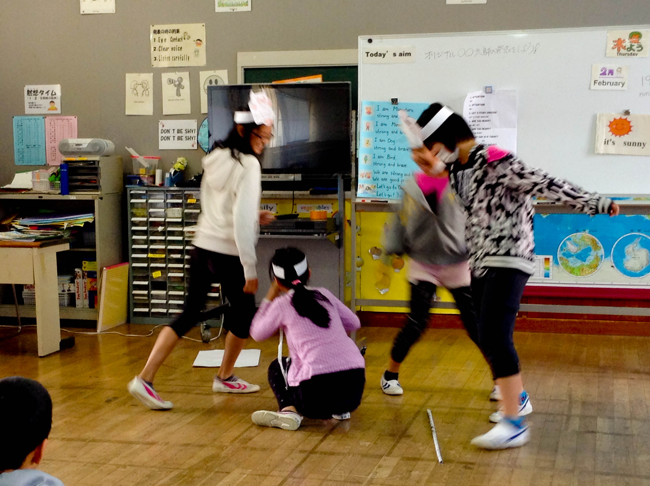 Outro objetivo era criar uma postura positiva em relação ao ensino de inglês. Ou seja, se divertir nas aulas do shōgakkō e entrar no chūgakkō com vontade de aprender mais, e aí sim, começar a estudar gramática de fato. Então, nas aulas, sempre havia músicas e jogos. Quando consegui o emprego fiquei preocupada em estudar e melhorar meu inglês, ler sobre pedagogia etc. Mas, quando cheguei lá, vi que era mais importante eu aprender a cantar e a ensinar músicas. E, também, a dançar e inventar coreografias. Uma colega americana dizia que ela pulava tanto na aula que todo dia depois do trabalho ela voltava pra casa e dormia. Eu não cheguei a esse ponto, mas no dia que dancei “Head, shoulders, knees and toes” (“Cabeça, ombro, joelho e pé”), umas 10 vezes, fiquei com o corpo todo dolorido.