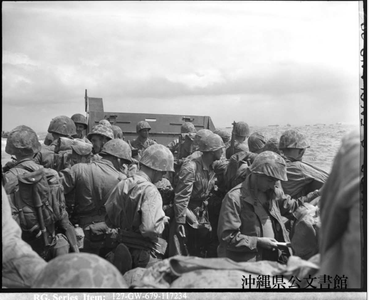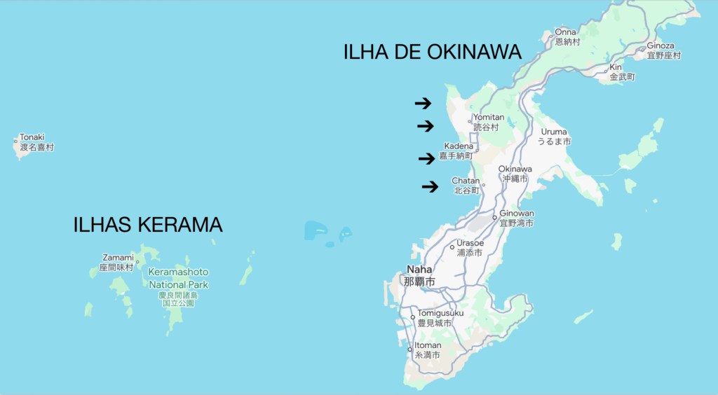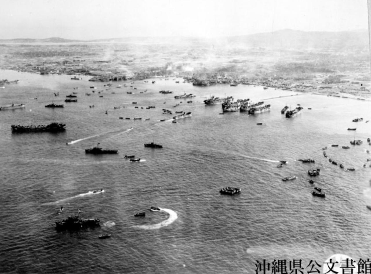 Após a conquista das Ilhas Kerama, o exército estadunidense invadiu a Ilha de Okinawa (a maior do arquipélago, onde se situa a capital Naha) no dia 1º de abril de 1945. Com 10 encouraçados, 9 cruzadores, 23 destroyers e 117 canhoneiras, a enorme frota de 1.300 embarcações cercou 10km da costa oeste da ilha, nos municípios de Yomitan, Kadena e Chatan. (Veja o mapa no início do texto.)