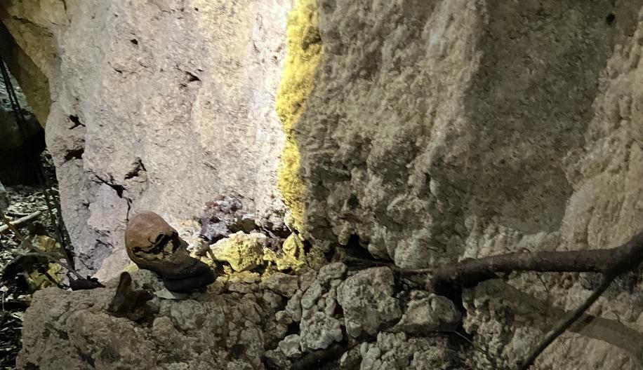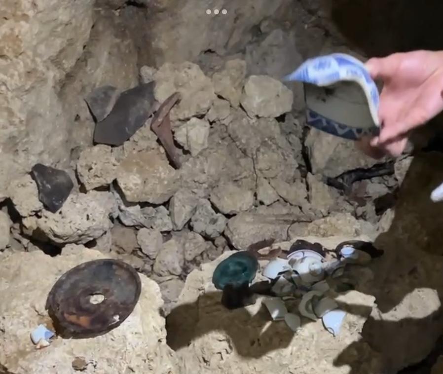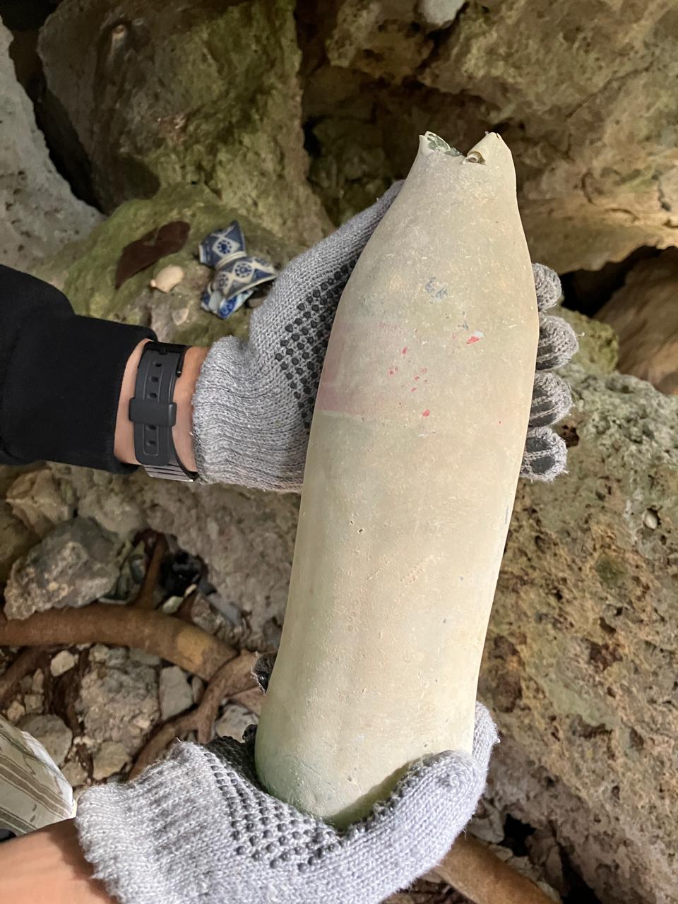 Entrando na caverna, a guia apontou alguns objetos e aí fiquei sabendo que o lugar havia sido usado para soldados japoneses e civis se abrigarem. E era um dos “piores” sítios de guerra que eu já tinha visto, porque estava muito cru. Havia muitos itens jogados: sapatos, garrafa de vidro e sobretudo louças. São coisas que eu não vi muito em outras cavernas, a não ser aquelas com visitas guiadas sobre a guerra que os objetos estão “expostos”. Outras estão fechadas ou já têm os objetos debaixo de terra e mato, invisíveis para nós.